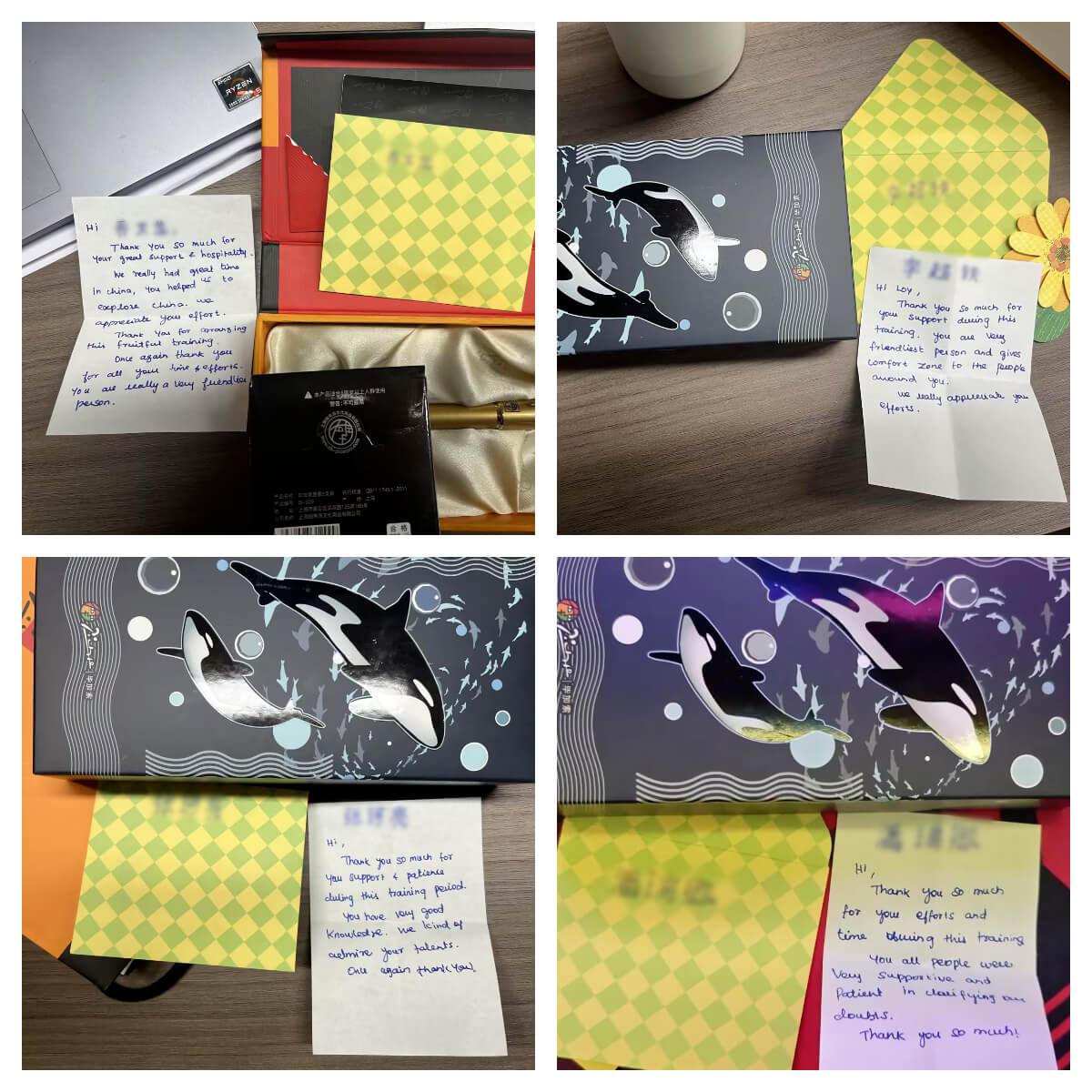近日,金年会为来自海外的合作伙伴开展的定制化培训项目圆满收官。在这场为期半个月的深度交流中,双方不仅碰撞出专业领域的智慧火花,更在朝夕相处中结下深厚情谊。临别之际,客户代表向我司四位核心员工赠送了象征友谊的定制钢笔,并亲笔写下四封饱含谢意与真诚的贺卡,为这段跨国合作添上一抹温情注脚。